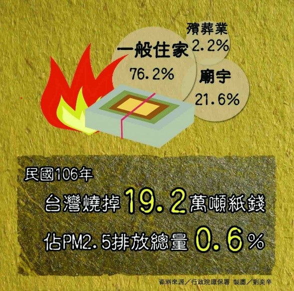 以民俗組織來說,在民俗活動中,香、金紙、鞭炮是三個常見且重要的科儀用品。以權責機關來說,在環境與空氣品質的意義上,這些用品在特定空間燃燒後產生能量,這些能量在空氣中以熱、氣體(二氧化碳等)與聲音傳遞。如果在公共空間進行民俗活動,依照臺灣的民俗信仰占七成五規模的人口比例,相當全國每年平均製造約2萬臺車的排放量。且環保署認為汙染源與民眾生活區域高度重疊,需要納入管制並進一步推動淨零碳排目標。