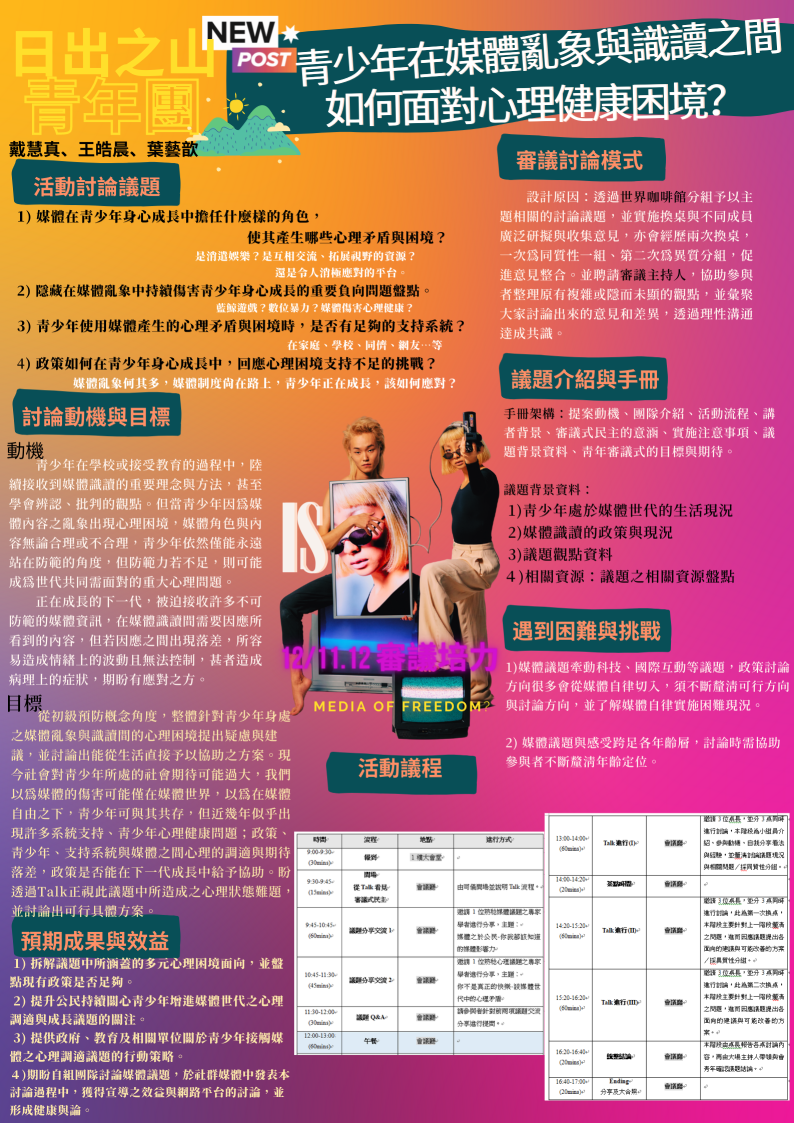 媒體雖深深影響這個世代,但並不代表這個世代的青少年都是因媒體而心理健康出問題的指標,而是青少年若受媒體問題影響,失去初級預防的措施,可能會造成後端的世代心理困境;期待透過審議式民主,省思如何在這世代重視建立正向的人格價值觀,接住青少年的發展身心,進而協助青少年整體認知與身心健康的建構過程格外重要。透過討論中找到方向,若又能於新的媒體教育政策白皮書擬定前,一同搭上新的政策推行、重視與改善,這些都是身為公民、並一同致力更好的社會生活模式之重要目標與方向。