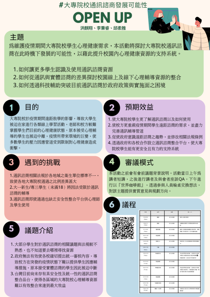 參考其他國家的相關案例,可以發現此類遠距通訊諮商的平台日益蓬勃的發展中,也有許多組織與大學院校參與合作開發。例如,BetterMynd 為美國現行已經與全美多所大學的遠距通訊諮商平台。學生只需透過智慧型手機或筆電登入就能便利的操作,這也使協助全美2100萬名大學生面對心理健康議題變得容易許多。平台可以提供專為每所合作大學校課的學生直接且快速的管道去選擇具經驗的心理師進行遠距通訊諮商。此外,BetterMynd平台也通過HIPAA和FERPA的核准,使所有學生能安全無虞的進行諮商,不需單由個人資訊或診斷資料的外洩。台灣目前仍未有一個個大專校都能共同使用的通訊諮商平台,也因此難以將各地的心理輔導資源發輝到最大的可能性。因此,我本也將會於本次活動中針對這個議題探討,藉由青年及多方與會人士的聲音,來設法促成政府與大學端共同開發或是和台灣現有已存在的類似平來(如FarHugs遠距抱抱)合作在未來提供所有台灣大專院校學生設置一個公共、便捷且安全的遠距通訊諮商平台。