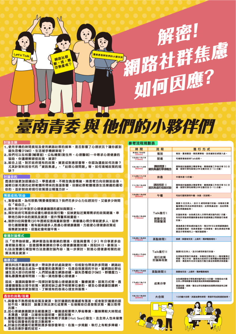 透過 Let’s Talk 的分享交流、經驗剖析,發散討論激發出更多想法,促進自我探索,最後收攏出解套方法,期許青年收穫嶄新觀點,更加認識與重視心理健康,進而關注、知悉心理健康政策與資源,同時增加對於自我的了解,讓思想豐富、身心健康的青年力量,促使國家發展不斷邁進。