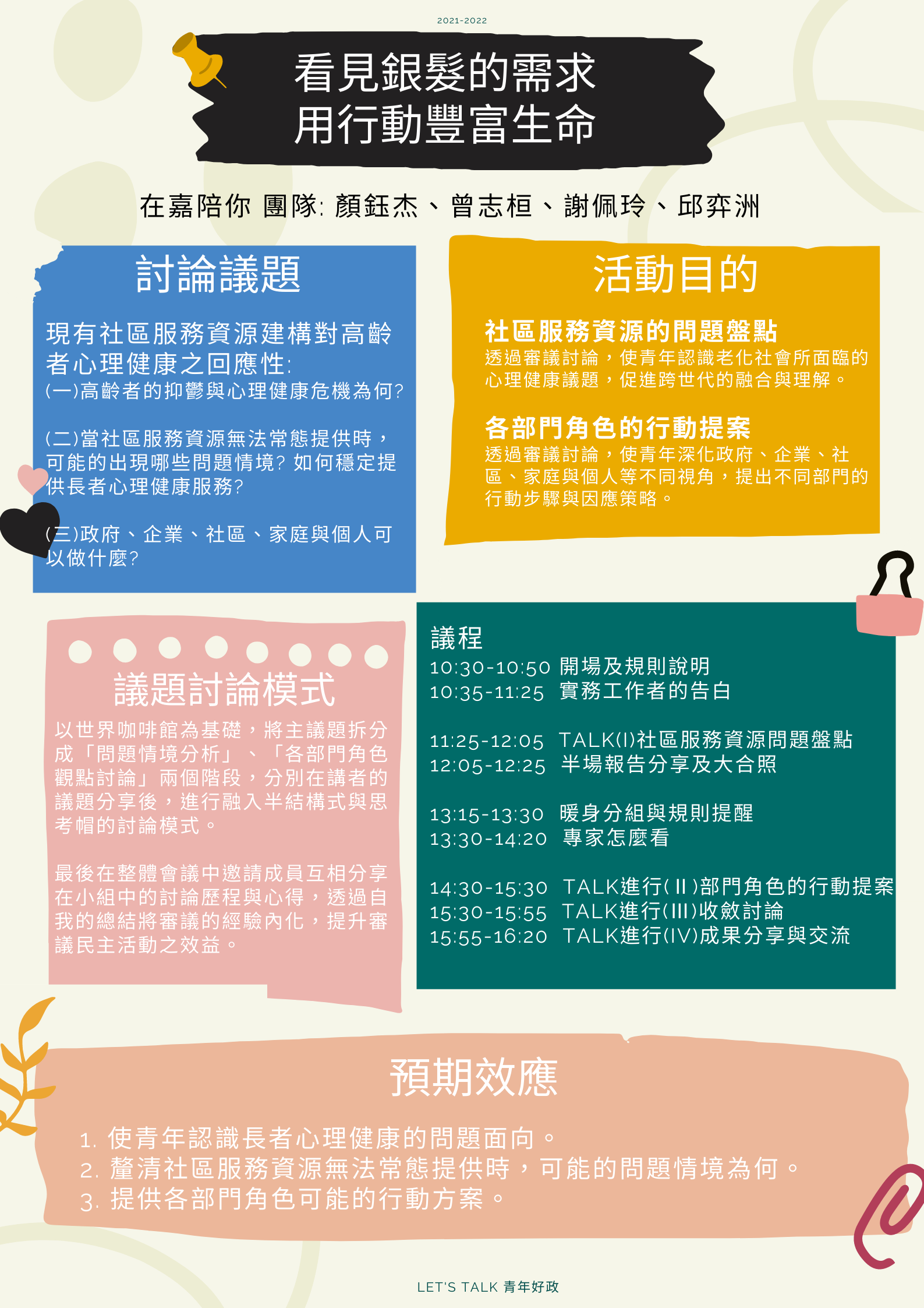 在逐漸老化的社會中,高齡者的心理健康不再只是單一部門所能回應的議題,透過探討政府、企業、社區、家庭與個人等不同部門間能夠如何動起來,讓青年在換位思考的過程中增進對高齡者的同理,並且提升倡議與行動的可能性。