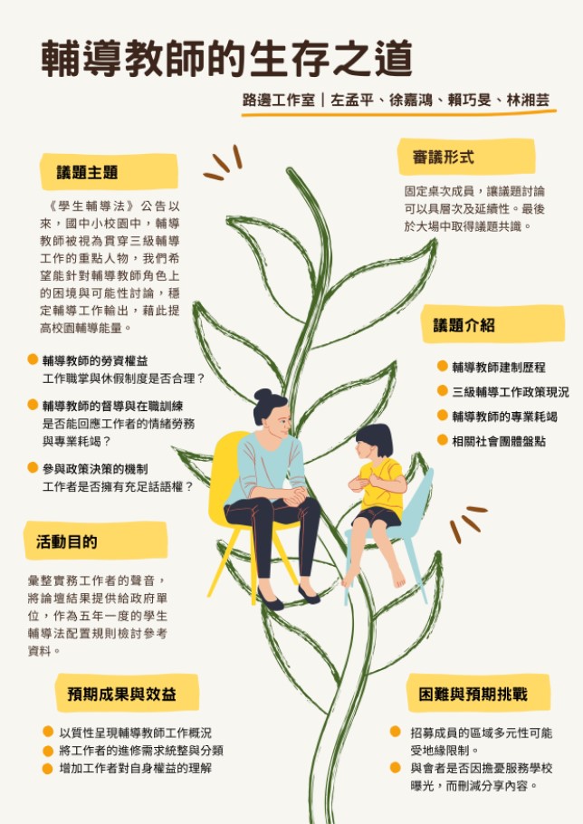 藉由青年好政平台,使一線工作者能夠在公平的情境下真實反映自己在實務現場的困境,同時透過討論,彙整輔導教師的自我成長需求,提供教育部由上而上的政策建議。並可以將論壇結果提供給《學生輔導法》第22條規範之五年一度的配置規則檢討。