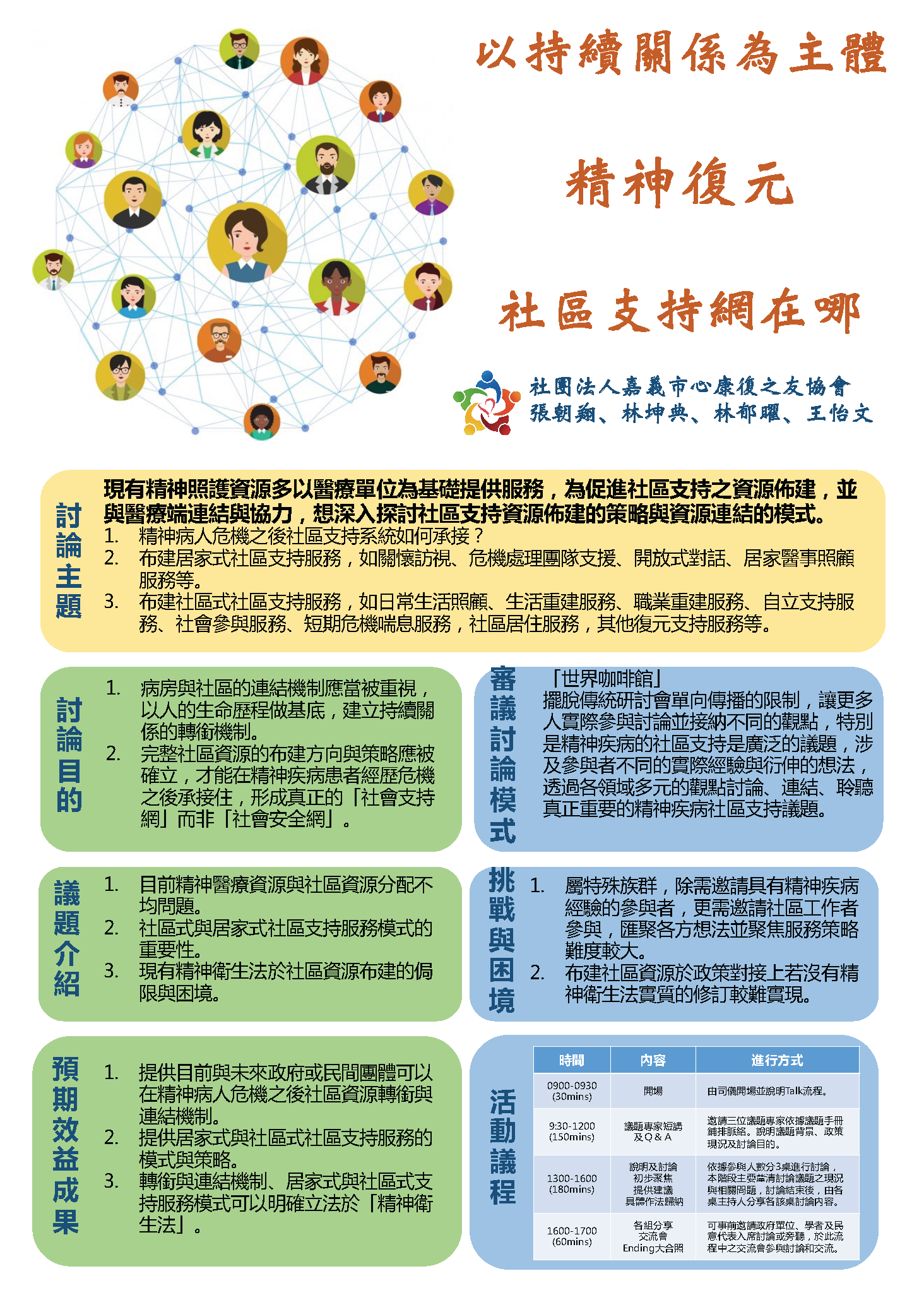 提出心理健康、精神疾病等社區支持資源佈建的方向,建構社會支持網而非社會安全網。