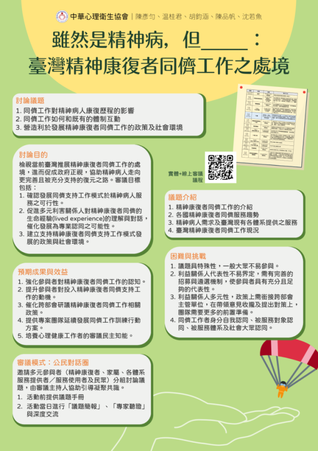 將討論包含「同儕工作 用於 精神病人康復歷程的影響 」、「 同儕工作如何和既有的體制互動 」以及「 如何營造發展精神康復者同儕工作的政策及社會環境 」等面向,期能凝聚對於精神康復者同儕工作多數人同意之方向。