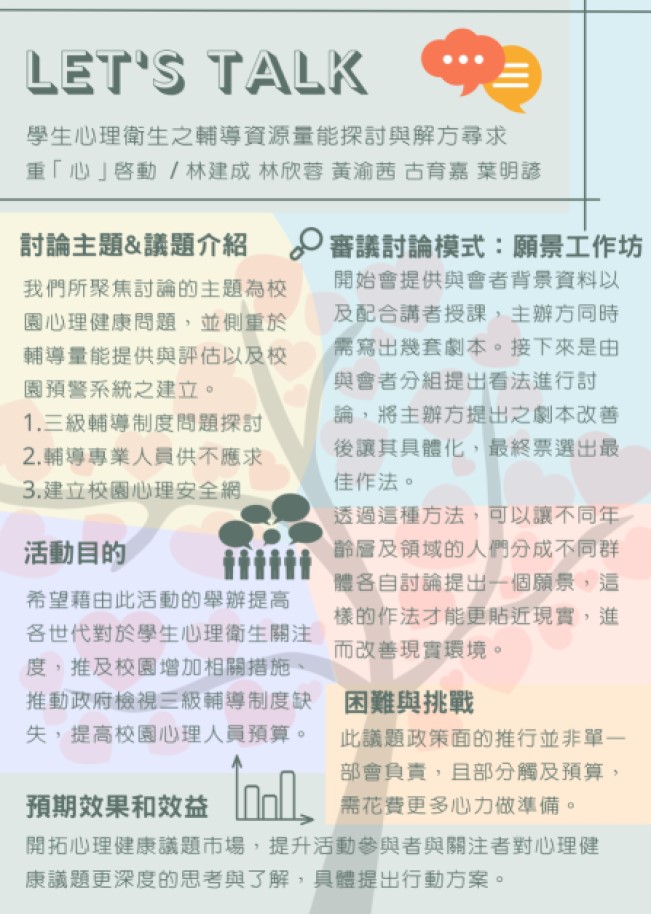 我們所聚焦討論的主題為校園心理健康問題,其中又以輔導量能提供與評估以及校園預警系統和心理衛生知識的建構與我們的主題有密切的關係。校園心理健康問題為國人在進入社會前的最後一道防線。如果在學生時代,學生並沒有對於心理健康的正確認知,以及大環境也沒有提供學生、專業輔導人員健康的輔導諮商制度,我們認為這樣的缺陷在有需要這些資源的學生族群上會造成隱疾,而這樣的隱疾如果不改善、治療,也會隨著年齡的增長而將這些能夠處理或未能夠被處理的問題帶進社會中,對於社會將會產生惡性循環以及不健康的心理環境。