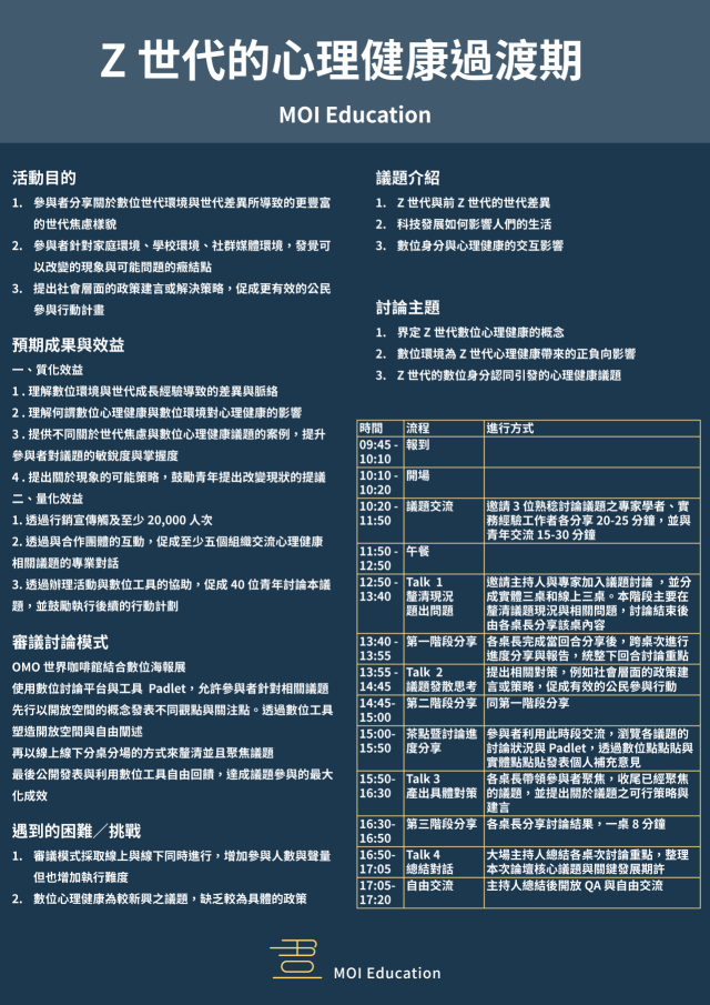 本次論壇的期待,可以分為三個層次說明。一、希望參與者可以透過講者引述議題,分享關於數位世代環境與世代差異所導致的更豐富多元的世代焦慮樣貌,進而討論數位心理健康與數位對真實心理影響的問題。二、希望建立在前述討論的基礎之上,基由家庭環境、學校環境、社群媒體環境,以個人的角度而言,發覺那些可以改變的現象與可能問題的癥結點。三、希望部分的參與者可以從其身分、經驗與立場,提出社會層面的政策建言或解決策略,促成更有效的公民行動計畫。要注意的是,本層次並非對法規制度層面的倡議與行動,而是針對心理健康過渡階段措施的提議 。