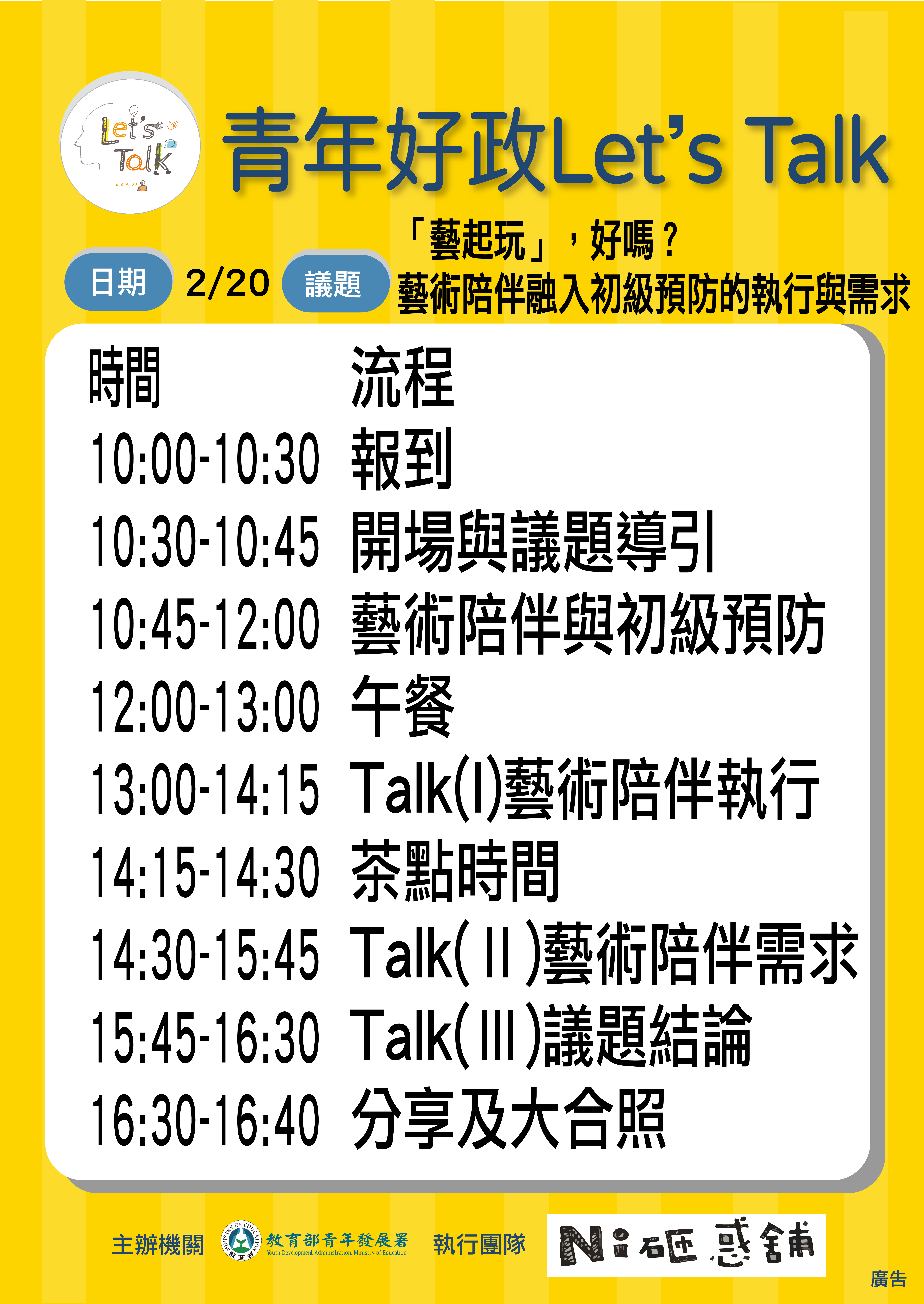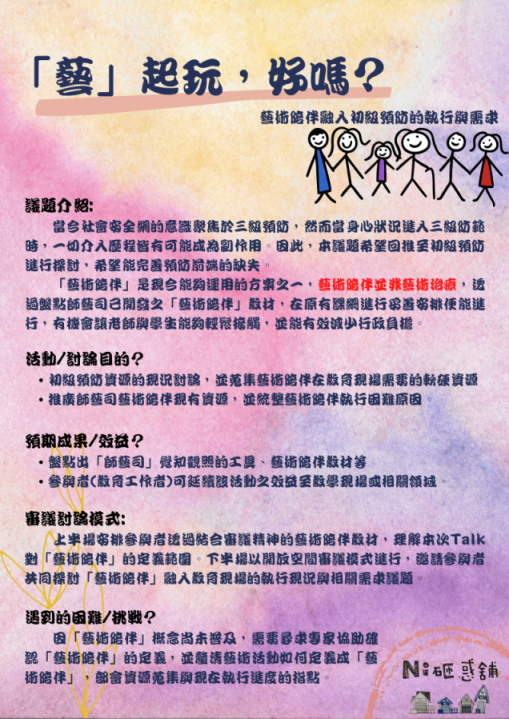 目前在強化社會安全網(第二期計畫110-114年)中,對於教育現場的規劃尚未全面,我們理解目前「藝術陪伴」的概念尚未普及,對於藝術陪伴的解釋與定義容易與「藝術治療」混淆,但藝術作為心理支持的工具面向而言,是相對可控,並能夠藉由盤點現有師藝司資源後便能夠進入現場的工具。