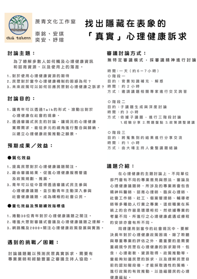 2. 透過審議式民主的討論,讓現況的心理健康實際需求,能從多元的視角進行整合與歸納,以建立心理健康政策推動之願景。