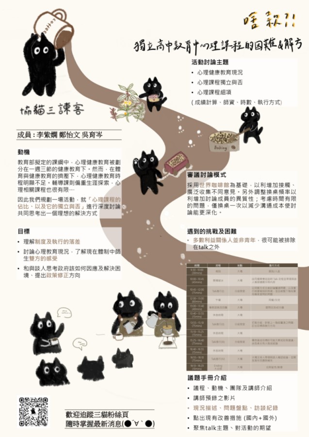 「作為高中生的你,或曾是高中生的你,需要什麼心理課程的支持?」在高中階段有很多心理需求與認同,而心理課程的形式與內容,要如何達成學生心理的健康,是今天執行團隊協貓三諫客希望與大家一起思考的。