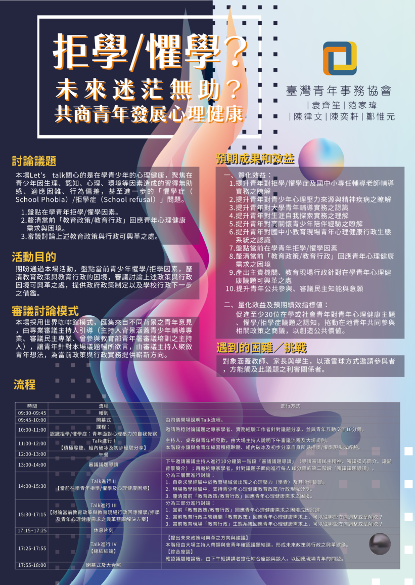 由臺灣青年事務協會所舉辦的Talk帶領大家討論拒學者所面對的困境與解套方案;黃之盈心理師表示拒學是指學生對於環境有焦慮、緊張與不安,並抗拒接觸或理解新的事務。學生在尚未被了解的情況下,更難被推出舒適圈。拒學的成因可能與人格特質有關,也可能是曾經的挫折、衝突、受威脅經驗所導致。輔導人員必須藉由看見他們的需求,建立與他們的人際關係連結,才能逐步解開他們的心防。