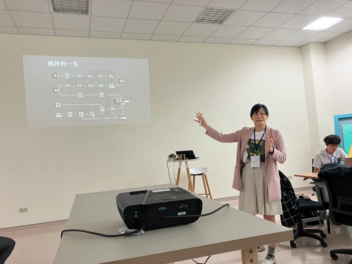 緊接著,團隊邀請財團法人塑膠工業技術發展中心技術工程師何承翰分享,先藉著大量數據及資訊,闡述溫室氣體對氣候變遷重大影響,同時也以實際案例說明目前臺灣針對環境保護努力,包含永豐餘生產永續循環杯、南亞回收塑膠製品再製、借助黑水虻處理廚餘,以及剩食種種處理方式等,並帶領與會者參觀永續材料圖書館,進行「氣候變遷減緩‧調適展」導覽,鉅細靡遺介紹各種回收材質的再利用方式。